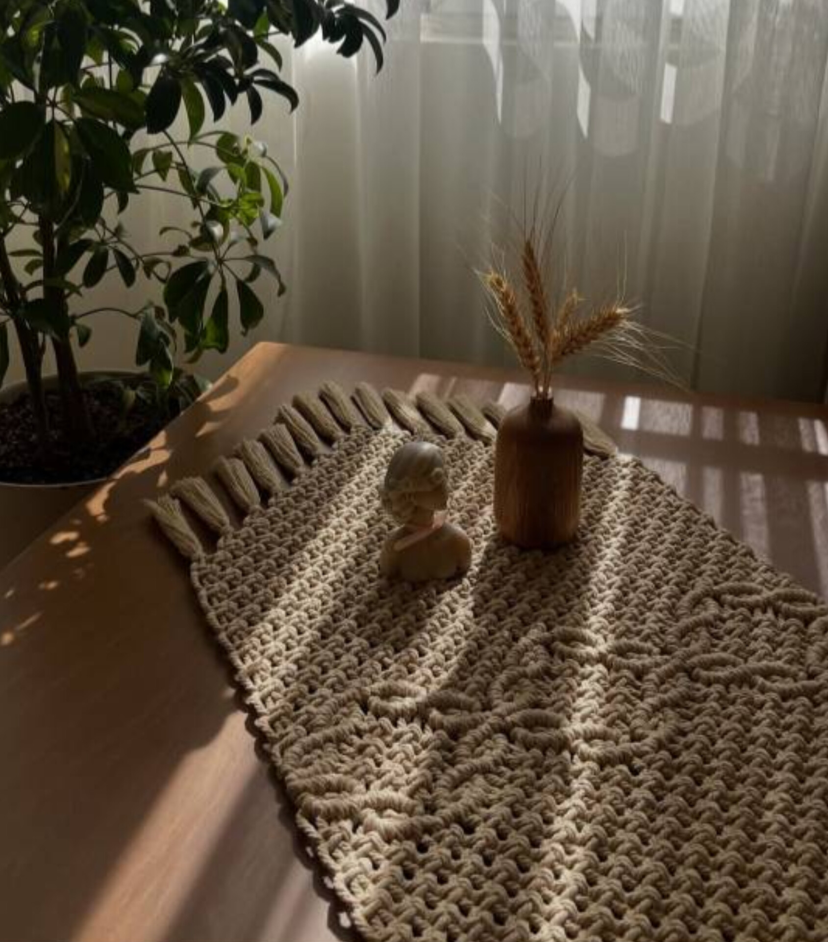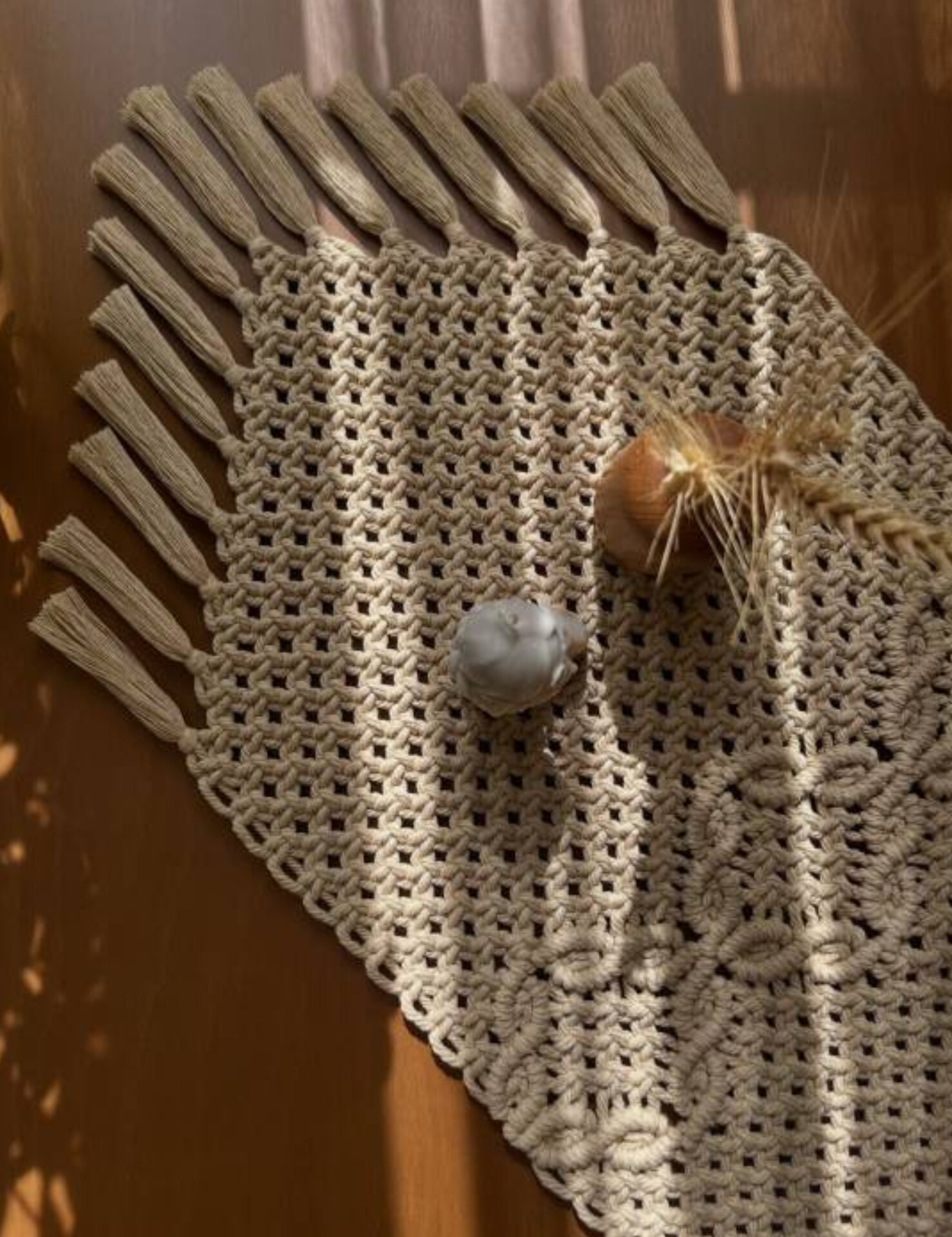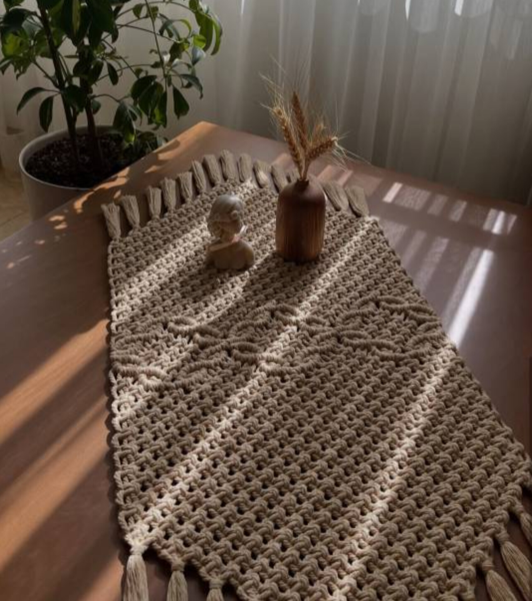 این رانر مکرومه با طرح اختصاصی گلبرگ، یکی از زیباترین انتخابها برای دکوراسیون میز ناهارخوری، کنسول و میز جلو مبلی شماست. رنگ شیری این کار به راحتی با هر تم رنگی در منزل ست میشود.