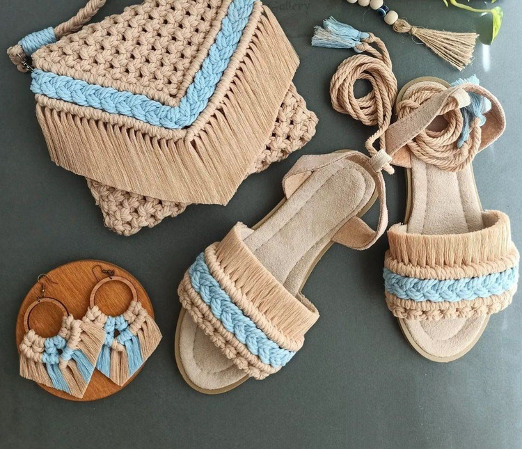 ست کیف و صندل و گوشواره مکرومه طرح دو رنگ
